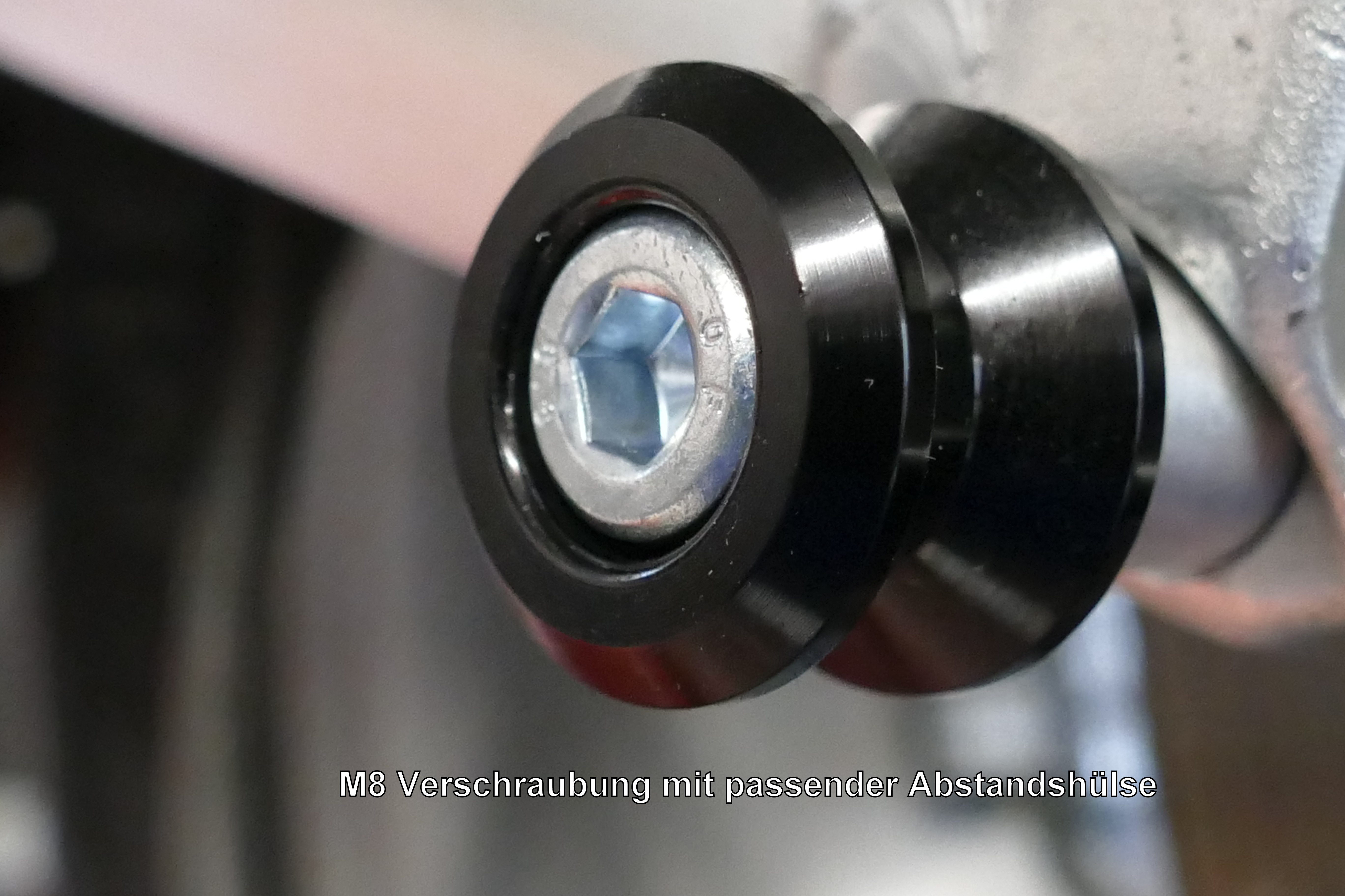 M8 Gewinde mit Schraube 8 x 35 mm / plus Abstandshülsen / plus Schraubenkopf-Abdeckkappe.